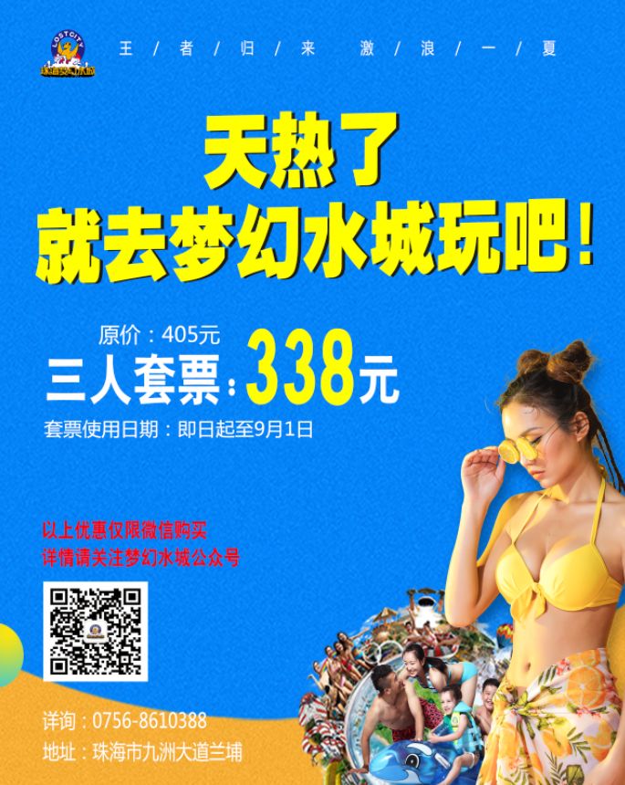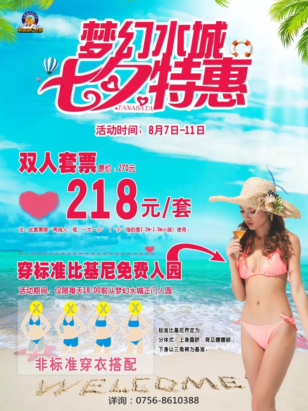 ◆活动方式:成年女性穿着梦幻水城指定样式比基尼,经现场工作人员核实无误后,即可从梦幻水城正门免票入园。